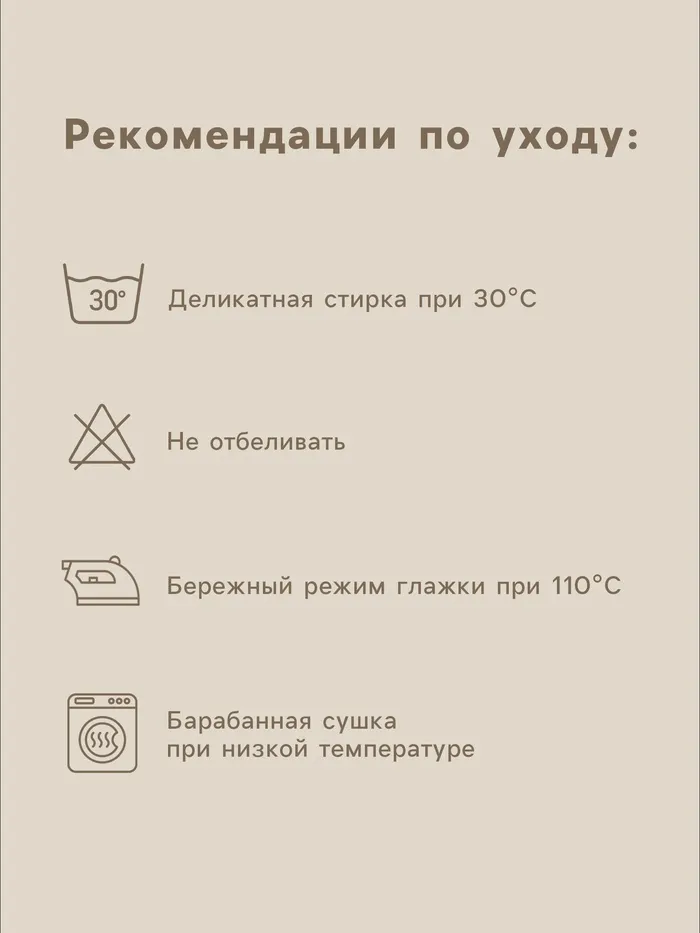 - Лёгкий уход: допускается барабанная сушка при низкой температуре, глажка при 150 °С.
