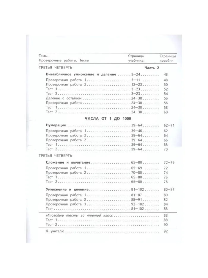 Сборник проверочных работ по математике для 3 класса — это полезное пособие для закрепления знаний и подготовки к контрольным работам. Оно дополняет учебник «Математика. 3 класс» авторов М. И. Моро и других, полностью соответствуя требованиям ФГОС. В пособии собраны тексты проверочных работ и тесты, которые помогают школьникам систематизировать изученный материал.