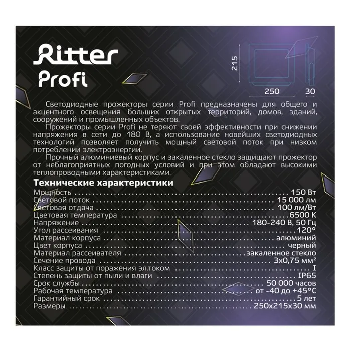 Прожектор светод серия PROFI, 230В, 150Вт, 6500К, 15000Лм, IP65, черн, гарантия 5 лет 53411 — Характеристики
