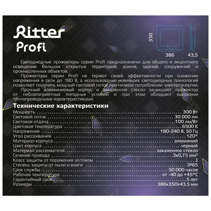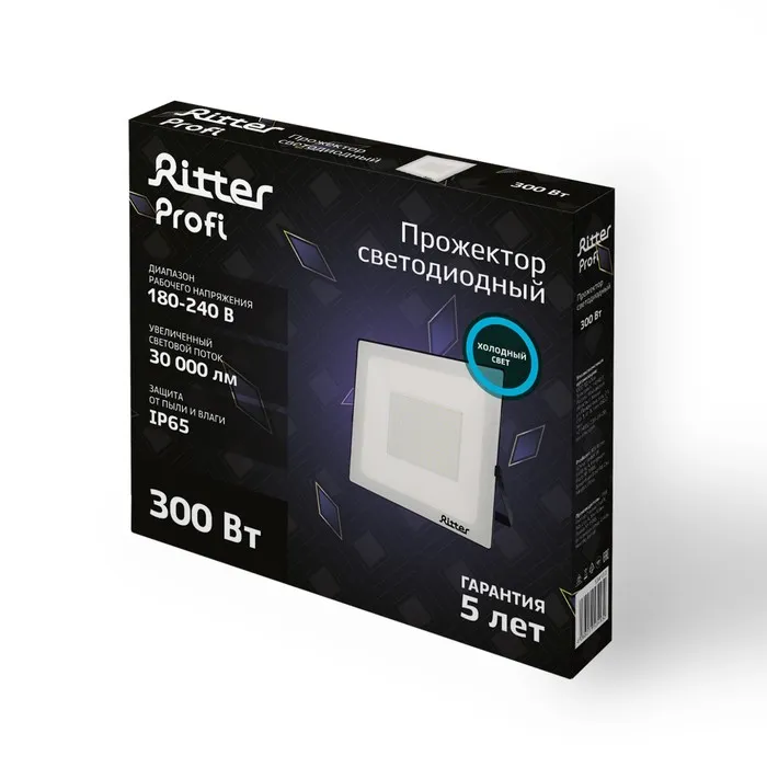 Прожектор светод серия PROFI, 230В, 300Вт, 6500К, 30000Лм, IP65, черн, гарантия 5 лет 53413 — Характеристики