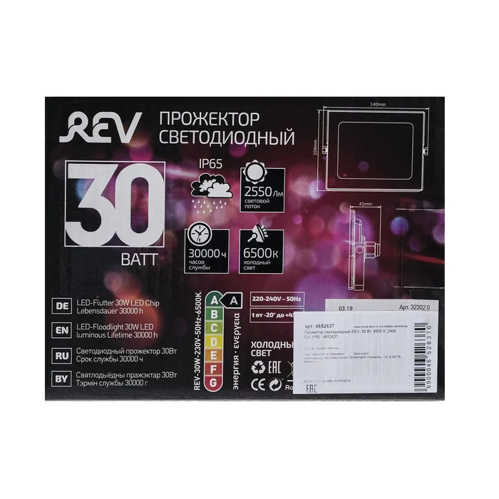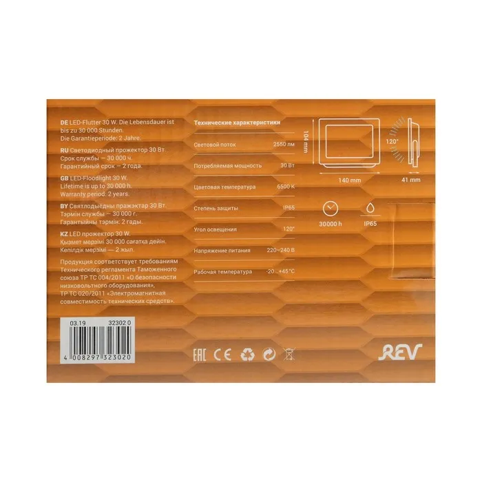Прожектор светодиодный REV, 30 Вт, 6500 К, 2550 Лм, IP65 — Характеристики