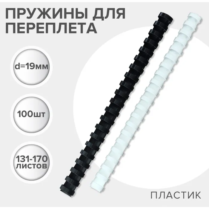 Пружины для переплета пластиковые, d=19мм, 100 штук, сшивают 131-170 листов, белые/чёрные, Гелеос — Характеристики
