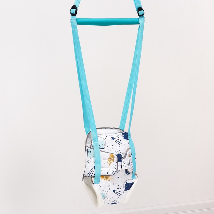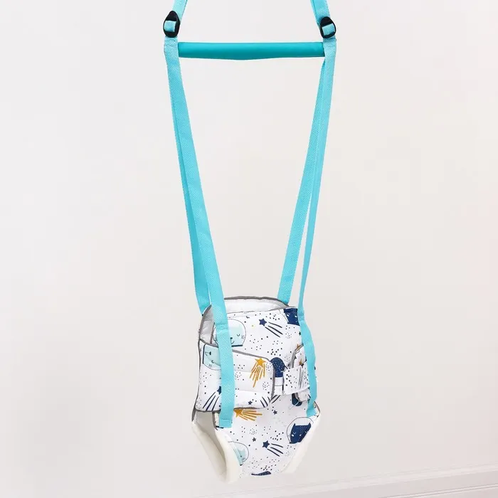 Посадите полугодовалого кроху в сиденье-штанишки. Малышу понравится активная игра, он будет подпрыгивать и качаться. Размер посадочного места можно настроить индивидуально, а за перекладину ребёнку будет удобно держаться.