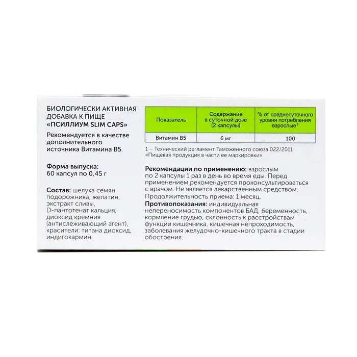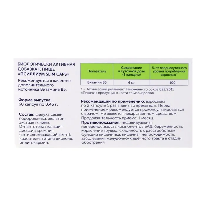 Состав: Шелуха семян подорожника, желатин, экстракт сливы, D-пантотенат кальция, диоксид кремния (антислеживающий агент), красители: титана диоксид, индигокармин.