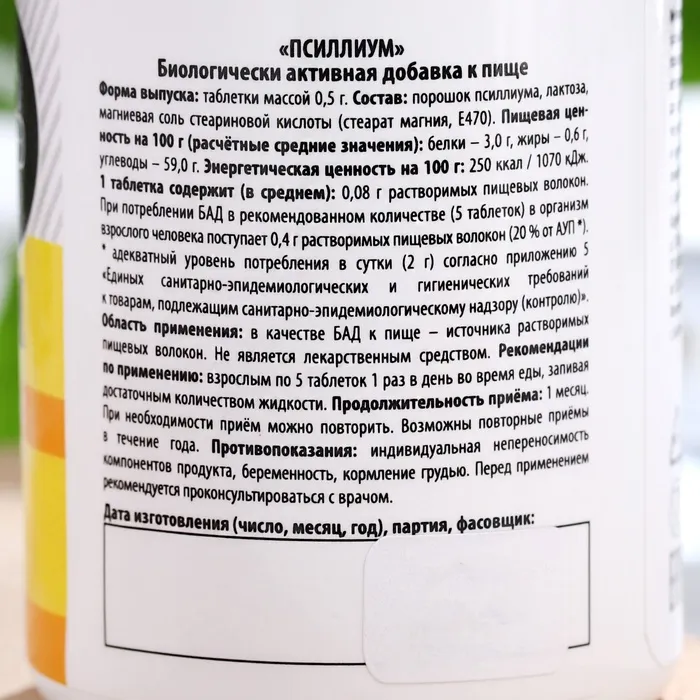 Состав: порошок псиллиума, лактоза, магниевая соль стеариновой кислоты (стеарат магния, Е470).