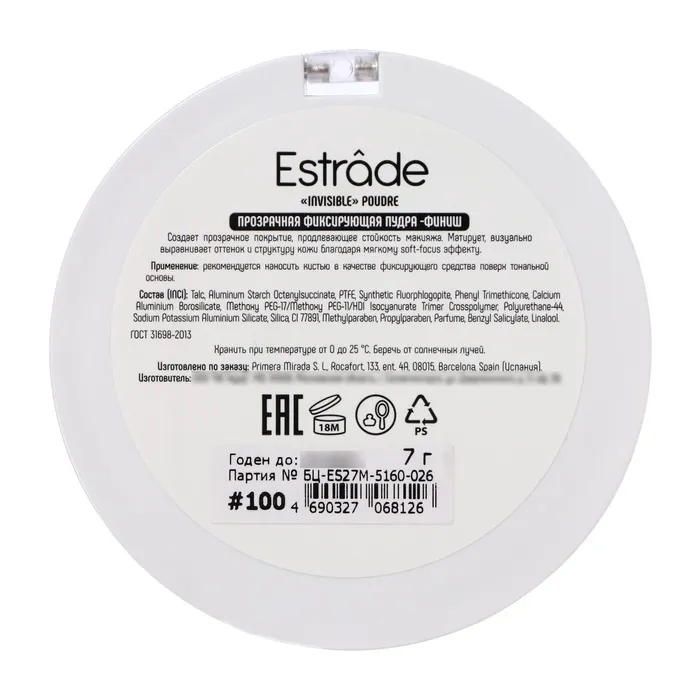 Пудра-финиш для лица Estrade Invisible, тон 100, прозрачный — Характеристики