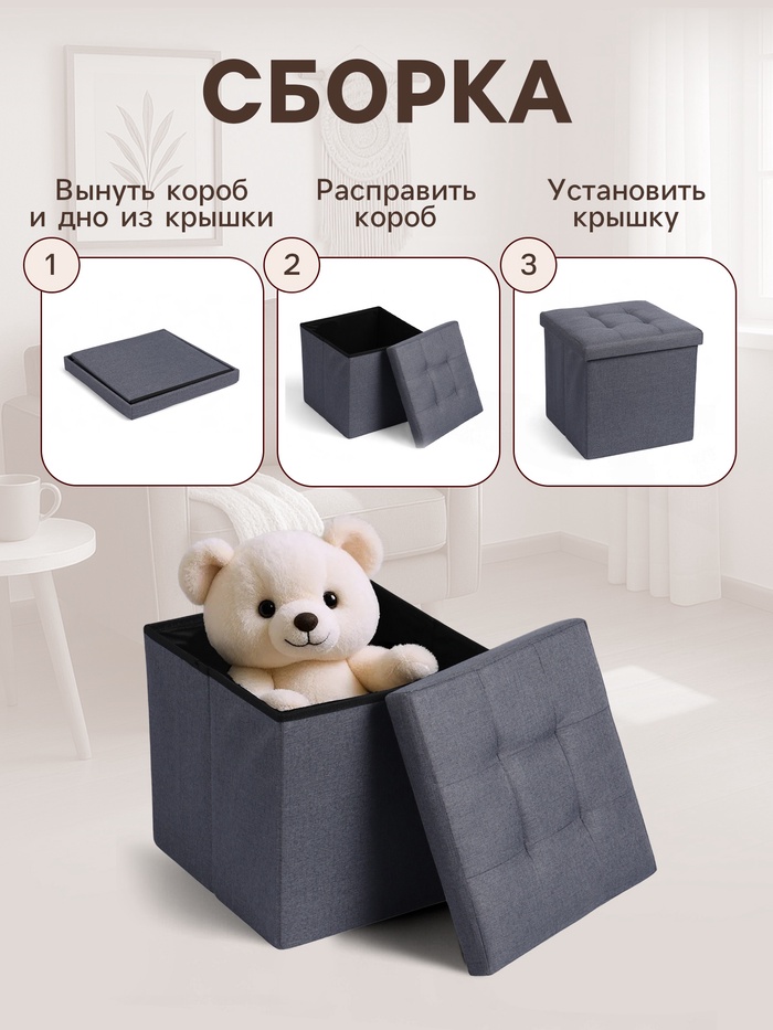 Пуф – короб складной «Клик Мебель», с ящиком, 380×380×380 мм, рогожка, цвет серый — Характеристики