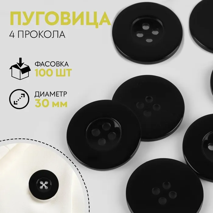 Пуговица 4 прокола, d=30 мм, чёрная — Характеристики