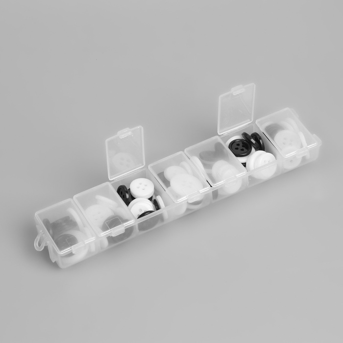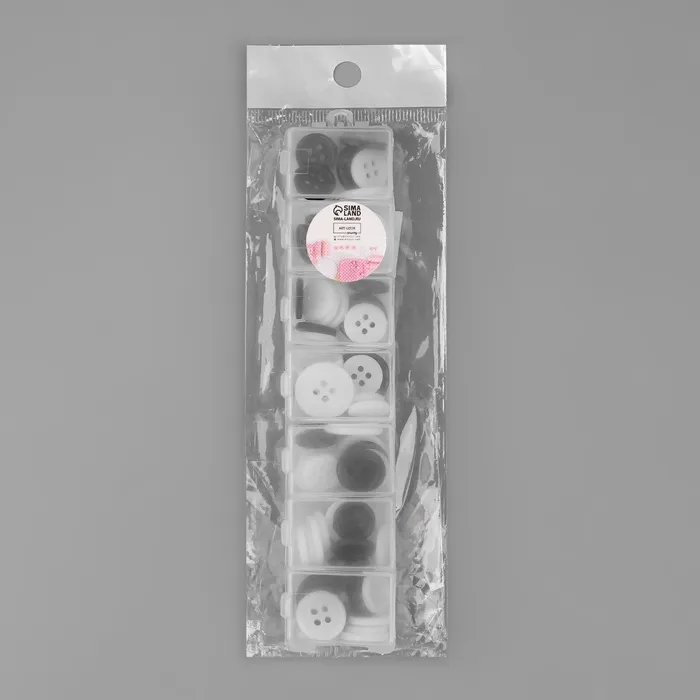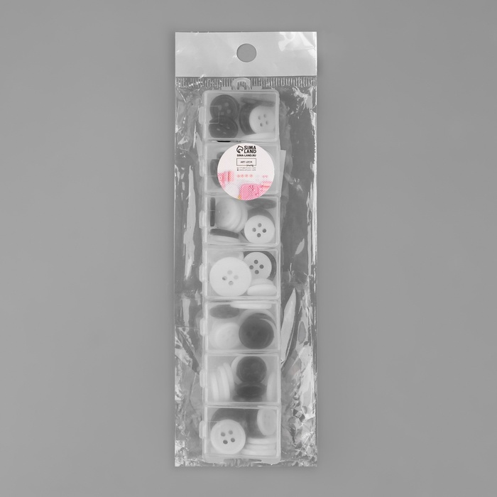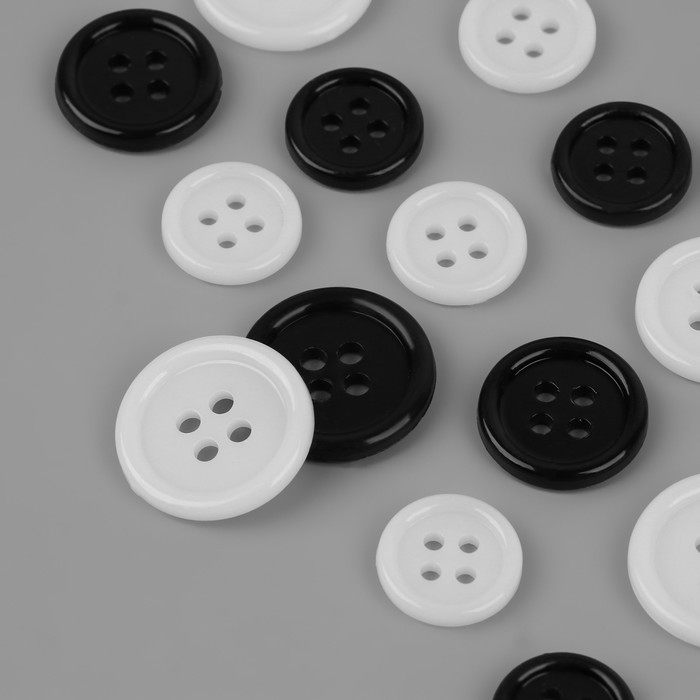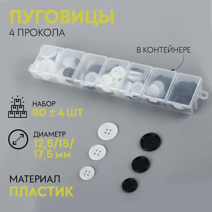 Пуговицы, 4 прокола, d=12.5/15/17.5 мм, набор 80±4 шт., в контейнере, чёрные, белые — Характеристики