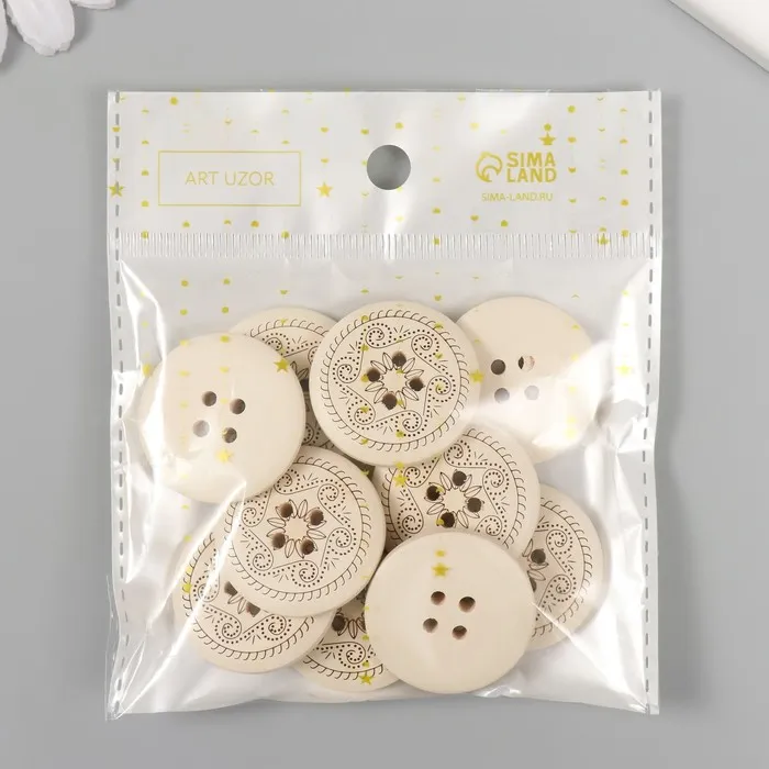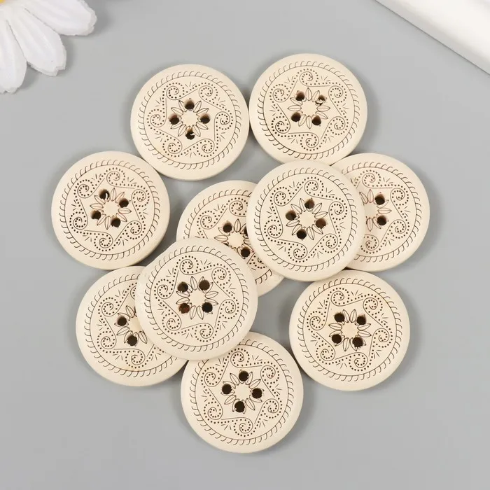 Пуговицы дерево для творчества 4 прокола «Узоры», белая, набор 10 шт., 3×3 см — Характеристики