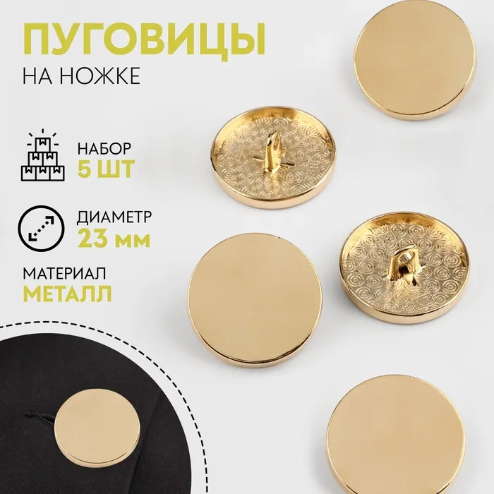 Набор из 5 золотых металлических пуговиц придаст благородный акцент пальто, жакетам или кожгалантерее. Диаметр 23 мм (36L) — оптимальный размер для верхней одежды. Глянцевое покрытие не тускнеет со временем, сохраняя насыщенный оттенок.