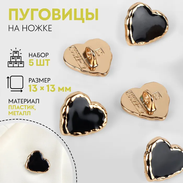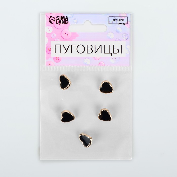 Пуговицы на ножке «Сердце», 13×13 мм, набор 5 шт., цвет чёрные, золотой — Характеристики