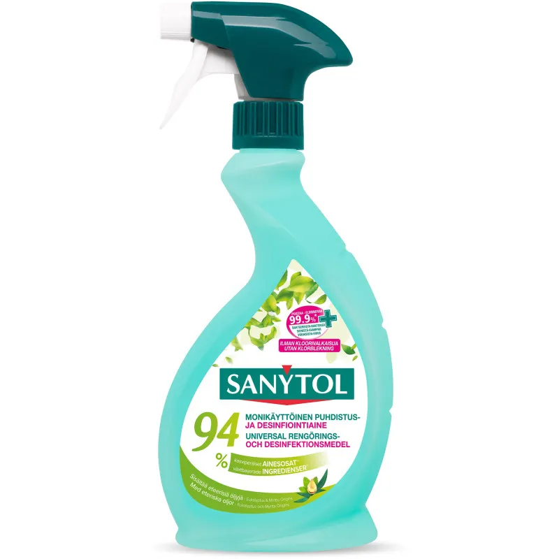 Многофункциональное чистящее и дезинфицирующее средство Sanytol – это удобный спрей для очистки и дезинфекции поверхностей в доме. Оно уничтожает до 99,9% грибков, вирусов и бактерий. Средство не содержит хлора и отбеливателей, а его состав на 94% состоит из растительных компонентов. Объем упаковки – 500 мл. Мы постоянно обновляем информацию о товаре, но рекомендуем всегда проверять данные на упаковке.