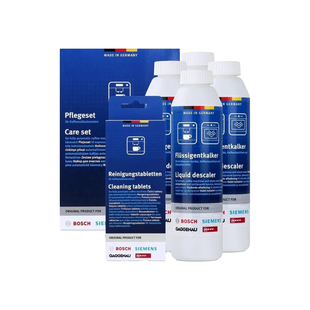 Этот набор, обеспечивающий эффективное обслуживание, содержит жидкое средство для удаления накипи и таблетки для очистки кофемашин, которые удаляют стойкие жиры и остатки.