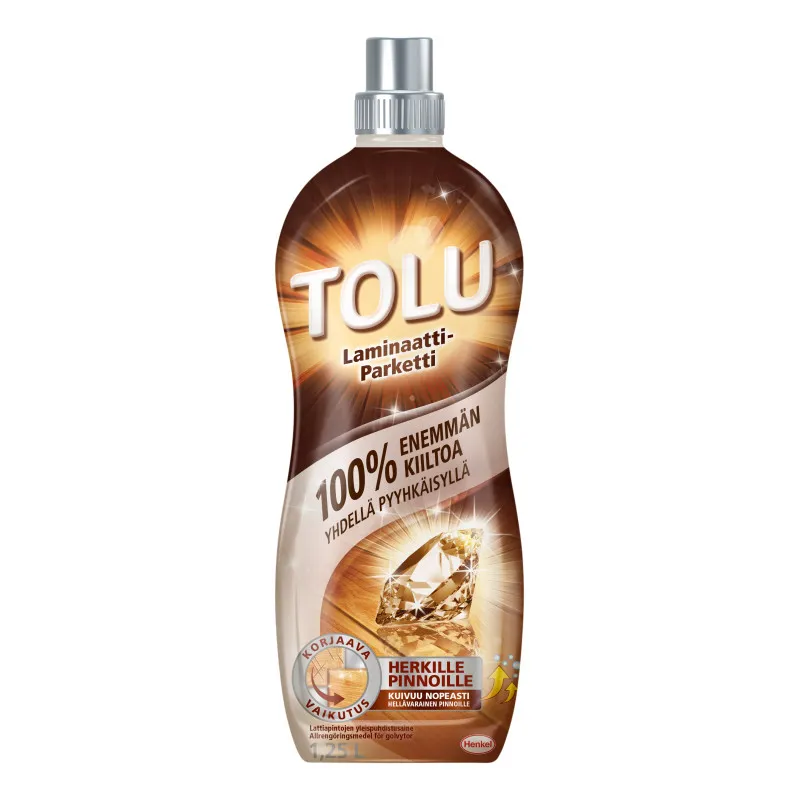 Tolu Laminaatti- ja Parketti – это универсальное чистящее средство, специально разработанное для ламината и паркетных покрытий. Его уникальная формула скрывает видимые царапины, восстанавливает первоначальный блеск поверхности, предотвращает прилипание грязи и защищает поверхности между уборками. Благодаря быстросохнущей и pH-нейтральной формуле, это средство идеально подходит для ламината и паркетных полов. Эффект от чистки начинается сразу после соприкосновения с поверхностью, а через пять минут после высыхания ваш пол обретает красивый первоначальный блеск. Рекомендуется использовать два колпачка средства на пять литров воды. Объем упаковки составляет 1,25 л.