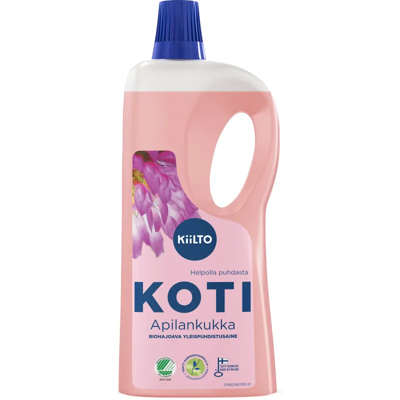 Kiilto Koti Biohajoava Apilankukka — это универсальное чистящее средство с ароматом луговых цветов. Оно эффективно очищает все моющиеся поверхности в доме, такие как полы, двери и мебель, оставляя приятный аромат. Подходит для очистки влажных помещений, удаляет жир и грязь.