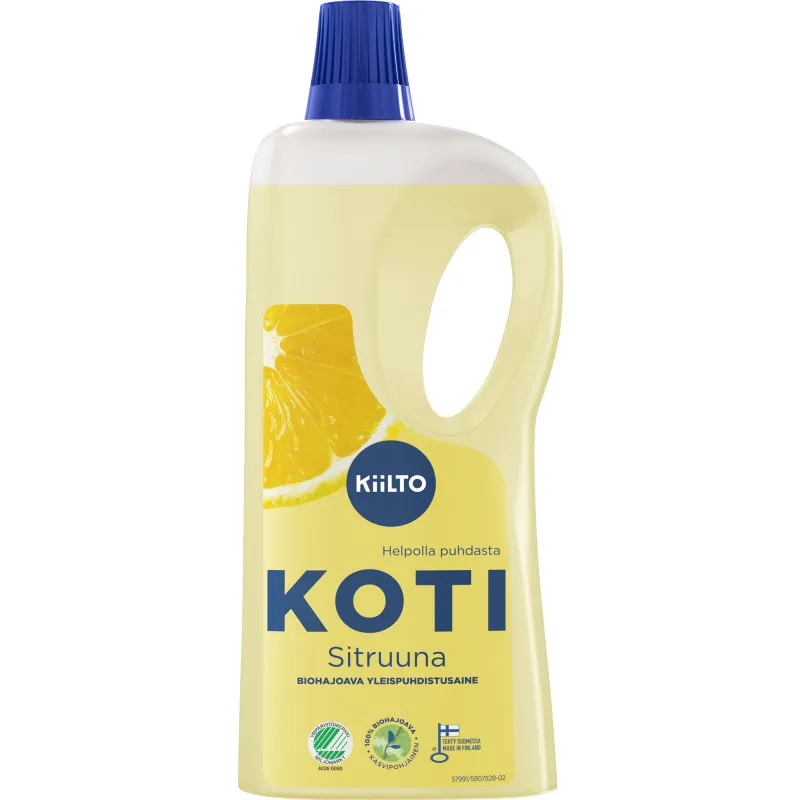 Kiilto Koti Лимон – биоразлагаемое универсальное чистящее средство с свежим цитрусовым ароматом. Это концентрированное средство эффективно очищает все моющиеся поверхности в доме, такие как полы, двери и мебель, оставляя за собой приятный аромат и свежесть. Также подходит для влажных помещений и удаления жира и грязи.