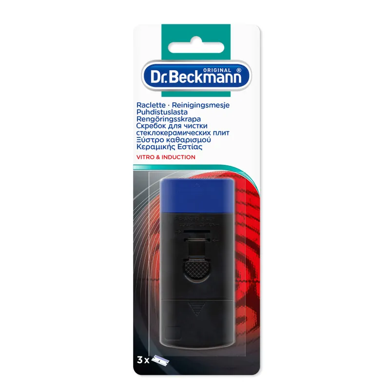 Чистящий скребок Dr. Beckmann эффективно удаляет пригоревшую пищу с поверхности керамической плиты. Этот инструмент подходит как для керамических стеклянных поверхностей, так и для индукционных плит. Оснащен регулируемым лезвием и включает 3 запасных лезвия в комплекте.