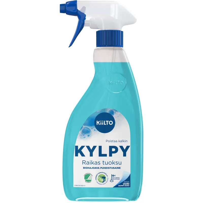 Очиститель Kiilto Kylpy Biohajoava эффективно очищает санузлы. Спрей подходит для удаления грязи и известкового налета с плитки, раковин, кранов и унитазов в ванной комнате. Он имеет приятный, свежий аромат. Продукт изготовлен с учетом экологических норм на солнечной энергии в Ханкасалми. Упакован в бутылку из 100% переработанного пластика с пенящимся распылителем, который снижает выделение аэрозолей и риск вдыхания вещества. Продукт имеет знак Лебедя, подтверждающий его экологичность, безопасность для пользователя и проверенную эффективность.