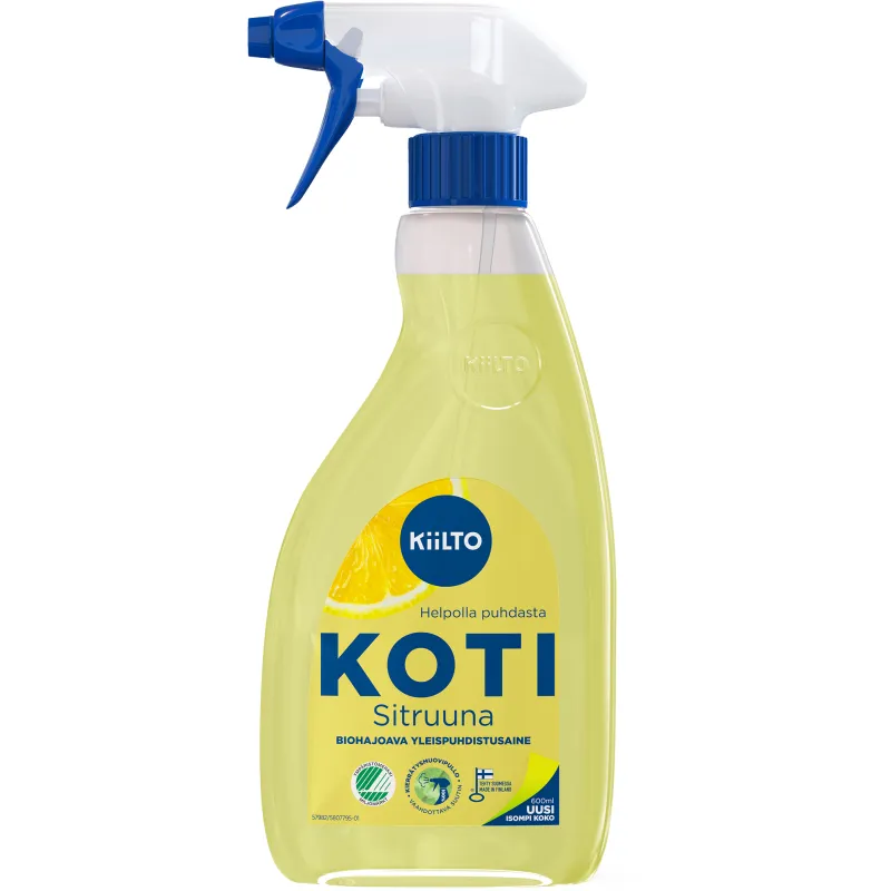 Kiilto Koti Лимон – это универсальный чистящий спрей с освежающим ароматом лимона. Этот биоразлагаемый продукт эффективно очищает все моющиеся поверхности в доме, оставляя их свежими и чистыми. Изготовленный с заботой об окружающей среде на солнечной энергии в Ханкасалми, спрей упакован в бутылку из 100% переработанного пластика с безопасным вспенивающим распылителем, который снижает выбросы аэрозолей и риск вдыхания вещества.