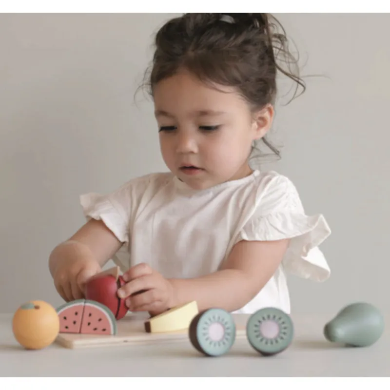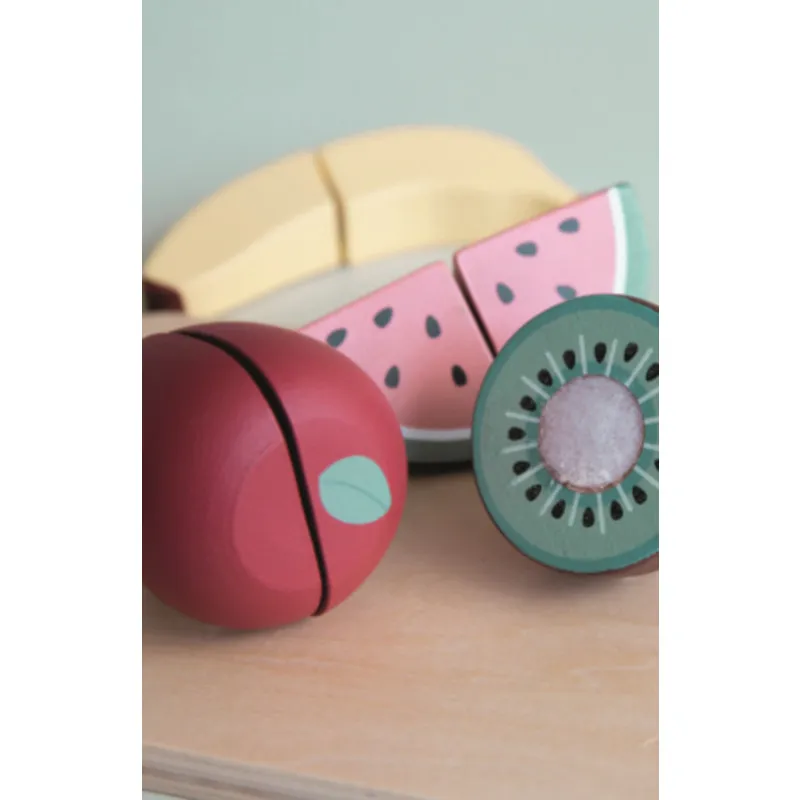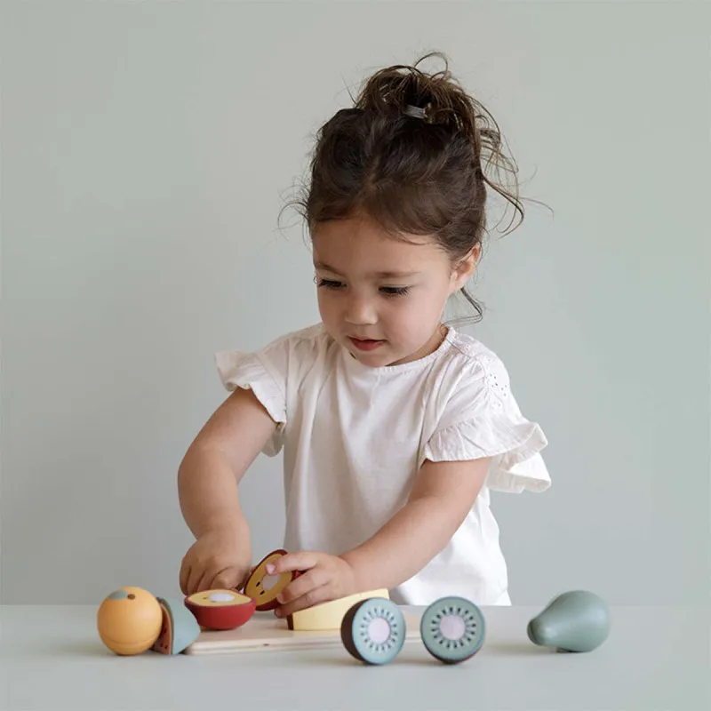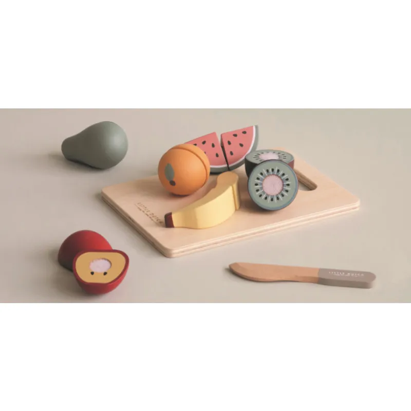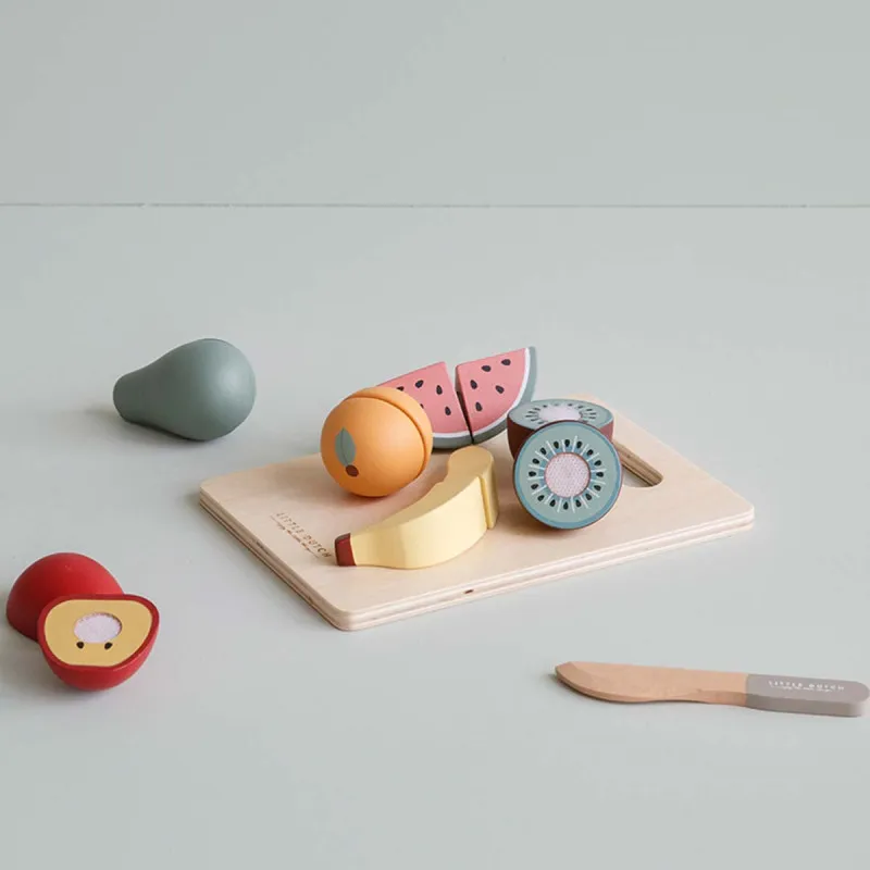 Разделите деревянные фрукты на разделочной доске и соедините их снова. Фрукты имеют липучку в центре, что облегчает их разделение и соединение. Набор Little Dutch включает 6 фруктов, нож и разделочную доску.