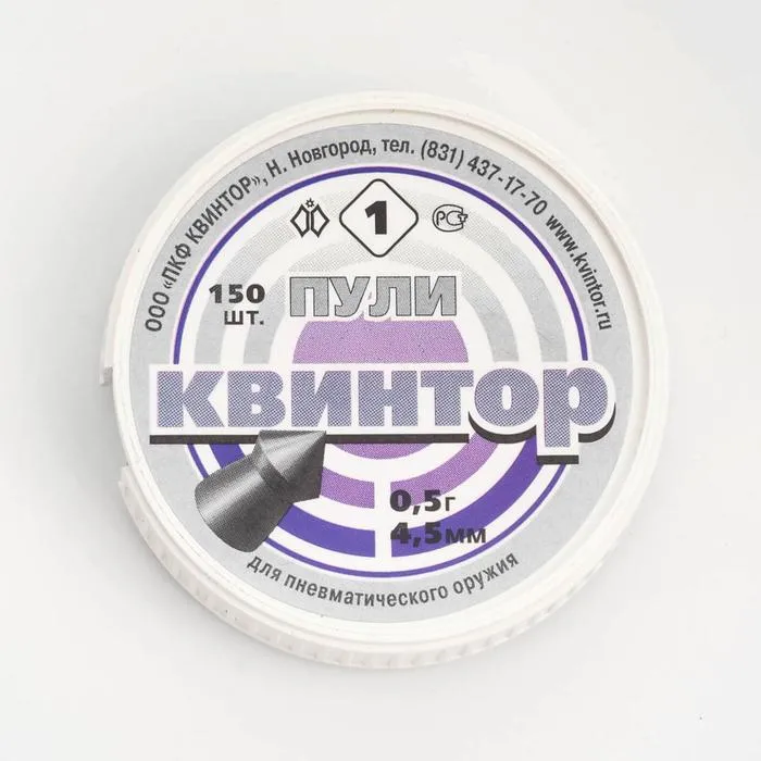 «Квинтор» — штампованные свинцовые пули с остроконечной формой головной части. Эта особенность строения значительно увеличивает степень ее проникающей способности. Пули имеют высокие показатели скорости (в полете) и неплохую кучность попадания в цель. Подходят для моделей пневматического оружия различной мощности.