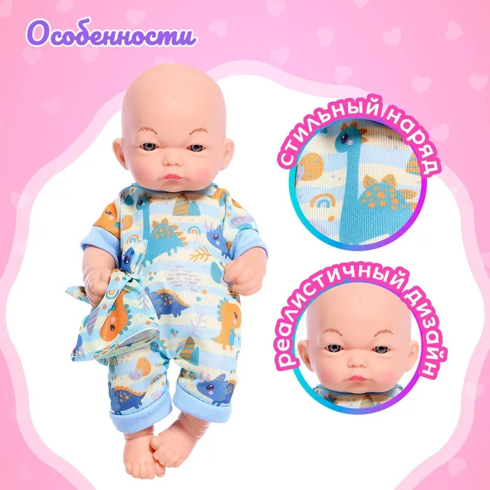 Этот милый пупс станет отличным подарком для ребенка. Он одет в стильный комбинезон с изображениями динозавриков, который можно снимать и менять на другие наряды. Этот симпатичный малыш высотой 24 см приглашает в увлекательные игры, которые развивают воображение и тренируют важные навыки.