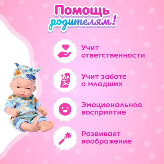 - Игра с таким пупсом учит ребёнка заботе о младших и ответственности, развивает воображение, а также предоставляет возможность проигрывать различные ролевые сценарии