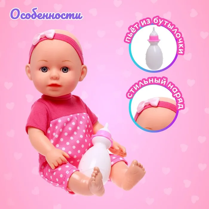 В комплект входит бутылочка. Аксессуар и кукла выполнены из пластика — безопасного материала для малыша.