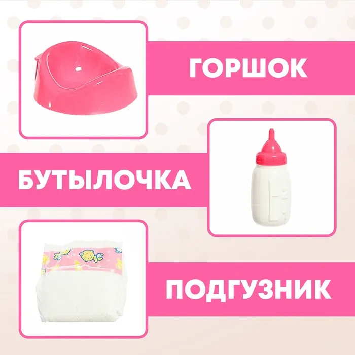 - В комплект входит бутылочка, подгузник и горшок. С этими аксессуарами ребёнок придумает множество весёлых игр.