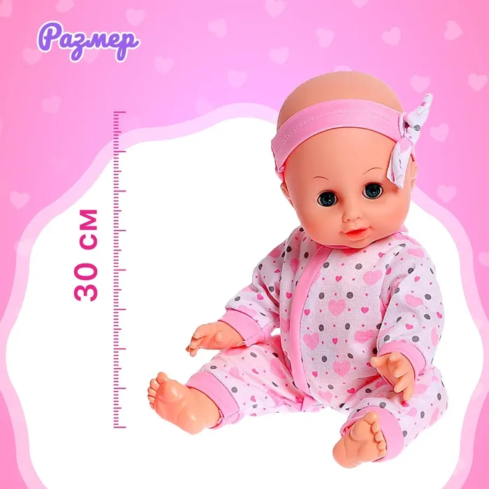 - Поёт песенку «Моя радость, я люблю тебя». Чтобы включить куклу, нажмите кнопку на груди.