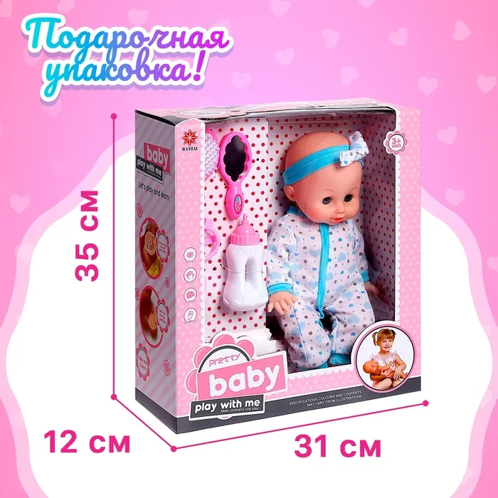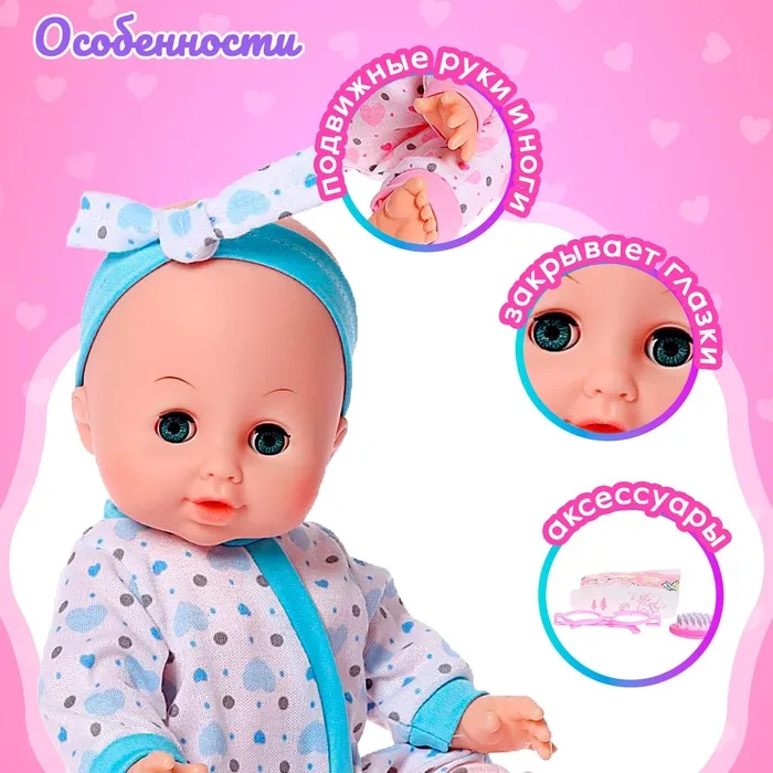 В наборе представлены аксессуары: расчёска, зеркальце, очки, бутылочка и подгузник. Аксессуары и кукла выполнены из пластика — безопасного материала для ребёнка, подгузник — из текстиля.