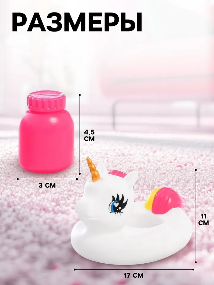 - В комплекте аксессуары для купания: баночка и круг-единорог.