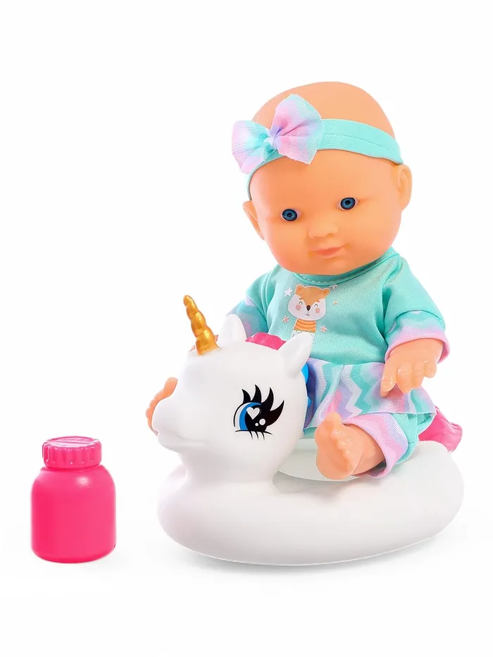 Пупс «Купание с единорогом» — это идеальный подарок для маленьких любителей водных забав. В комплекте идёт всё необходимое для весёлого купания: кукла, баночка и круг для купания в виде единорожки. Одежда пупса легко снимается, что делает игру ещё более увлекательной и разнообразной.
