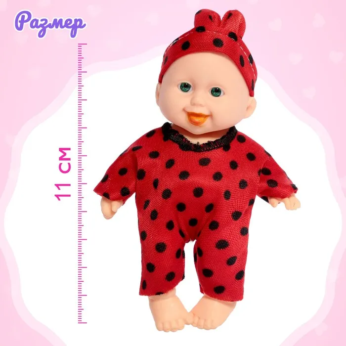 У куклы двигаются руки, ноги. Ребёнок придумает множество игр с пупсом и будет учиться заботе и ответственности. Рост куклы — 11 см. Пупсик резиновый. Его можно купать. Одежда снимается.