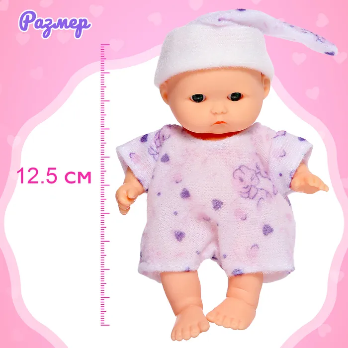 Пупс выполнен из резины, его можно купать. Высота — 12 см. Ножки выпрямляются.