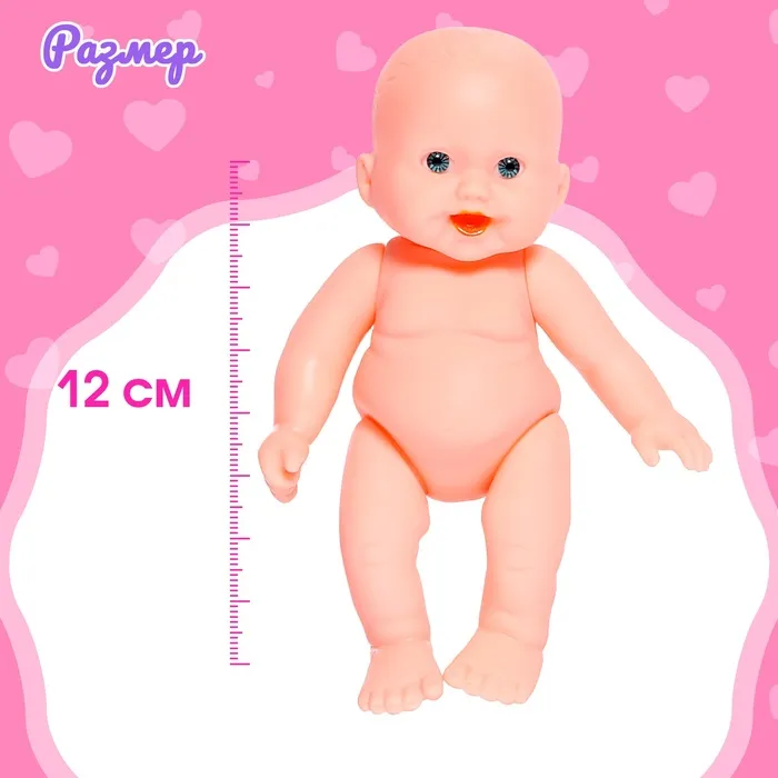 У куклы двигаются руки, ноги. Ребёнок придумает множество игр с пупсом и будет учиться заботе и ответственности. Рост куклы — 12 см. Пупсик выполнен из пластика. Его можно купать.