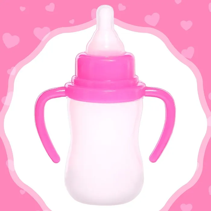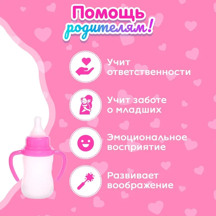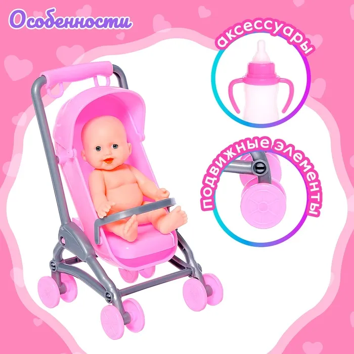 В комплекте есть аксессуары для весёлой игры: коляска, бутылочка и соска.