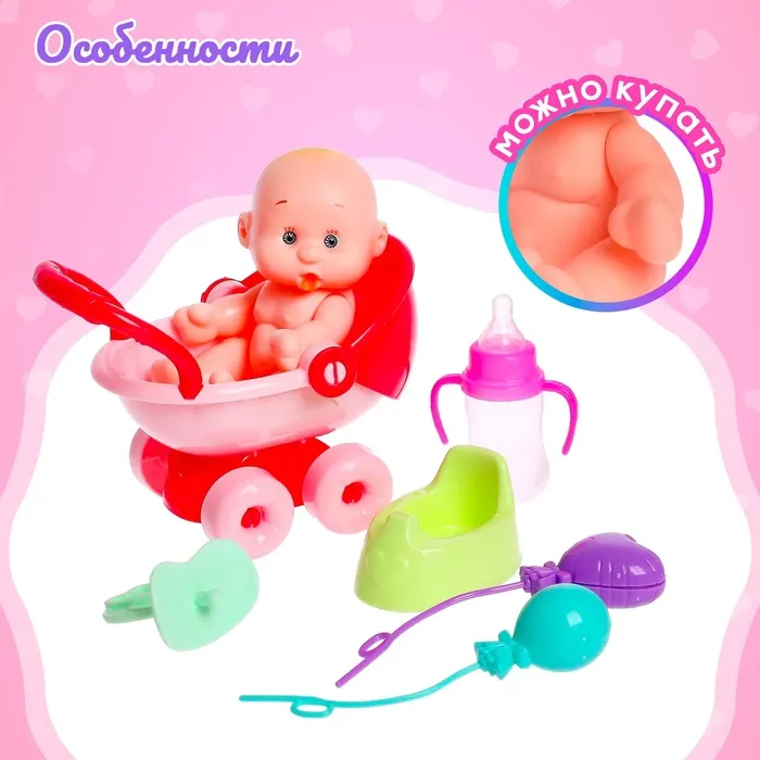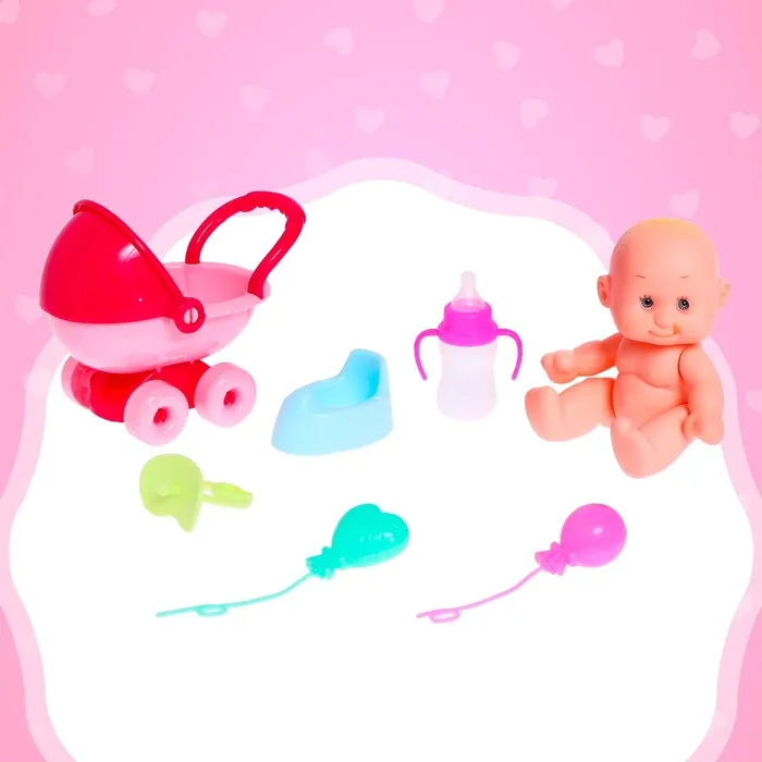 В комплекте пластиковые аксессуары: коляска, горшок, соска, бутылочка и 2 воздушных шарика. Наборы представлены в разных оттенках.