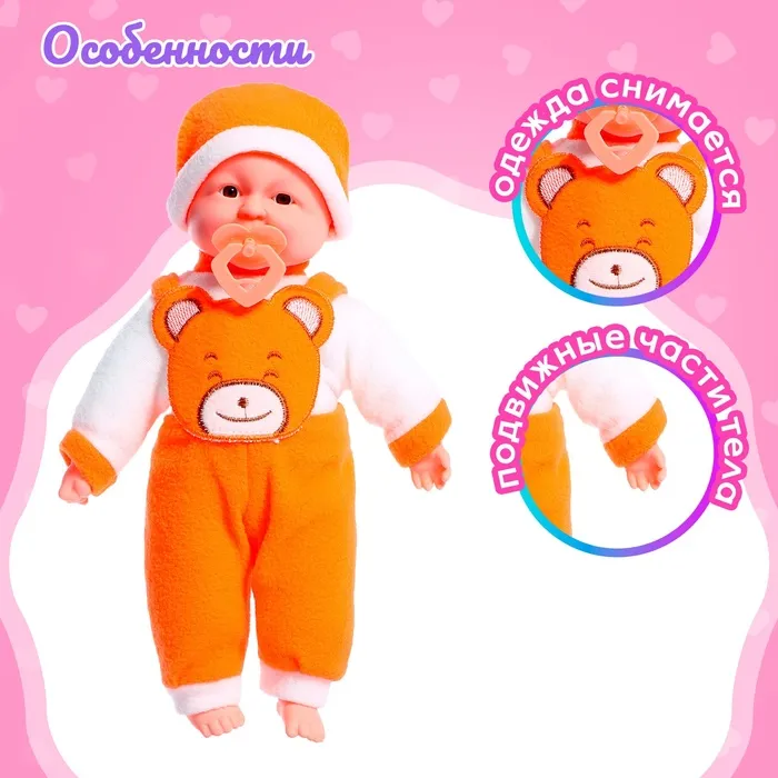 Очаровательный пупсик покорит малышку с первого взгляда. Ведь этот кроха почти как настоящий ребёнок. Он умеет смеятся, говорить "мама" и "папа" — с таким малюткой девочка никогда не соскучится! Приятный мягкий наполнитель куклы позволяет девочке укладывать её с собой в кроватку, в обнимку с карапузом засыпать совсем не страшно.