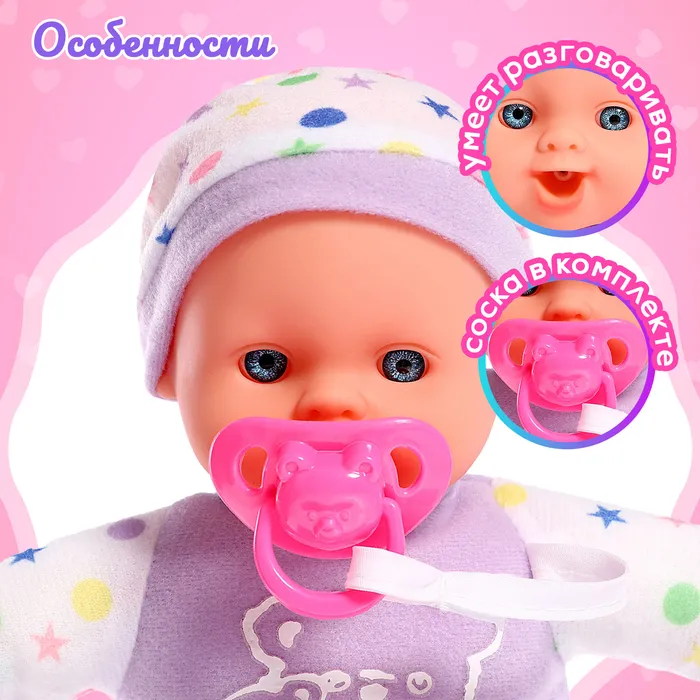 - Плачет, если вынуть соску изо рта. Говорит слова «мама», «папа». Чтобы включить звуковые эффекты, нажмите кнопку на животе.