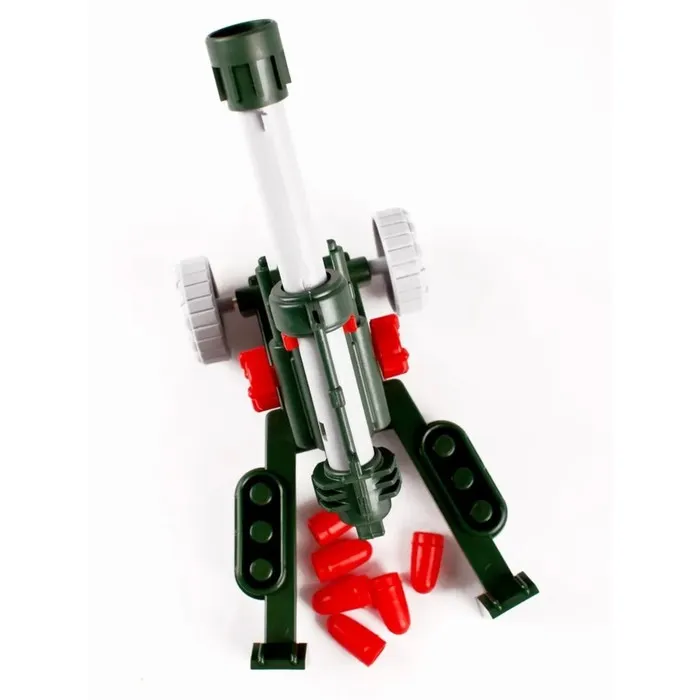 - Прочный и стильный: пушка выполнена из качественного пластика зелёного цвета, который ассоциируется с военной техникой.