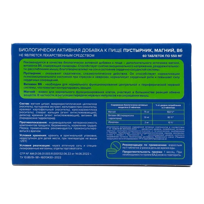Витамин В6 участвует во многих метаболических процессах, способствует улучшению всасывания магния из желудочно-кишечного тракта и его проникновению в клетки. Он участвует в обмене веществ и необходим для нормального функционирования центральной и периферической нервной системы.