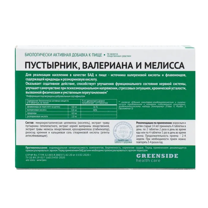 Состав: Целлюлоза микрокристаллическая (носитель), экстракт травы пустырника пятилопастного, экстракт корней валерианы лекарственной, экстракт травы мелиссы лекарственной, кроскармеллоза (стабилизатор), диоксид кремния и кальциевая соль стеариновой кислоты (агенты антислеживающие).