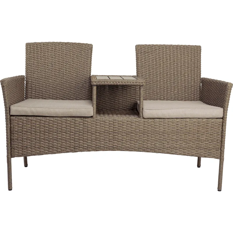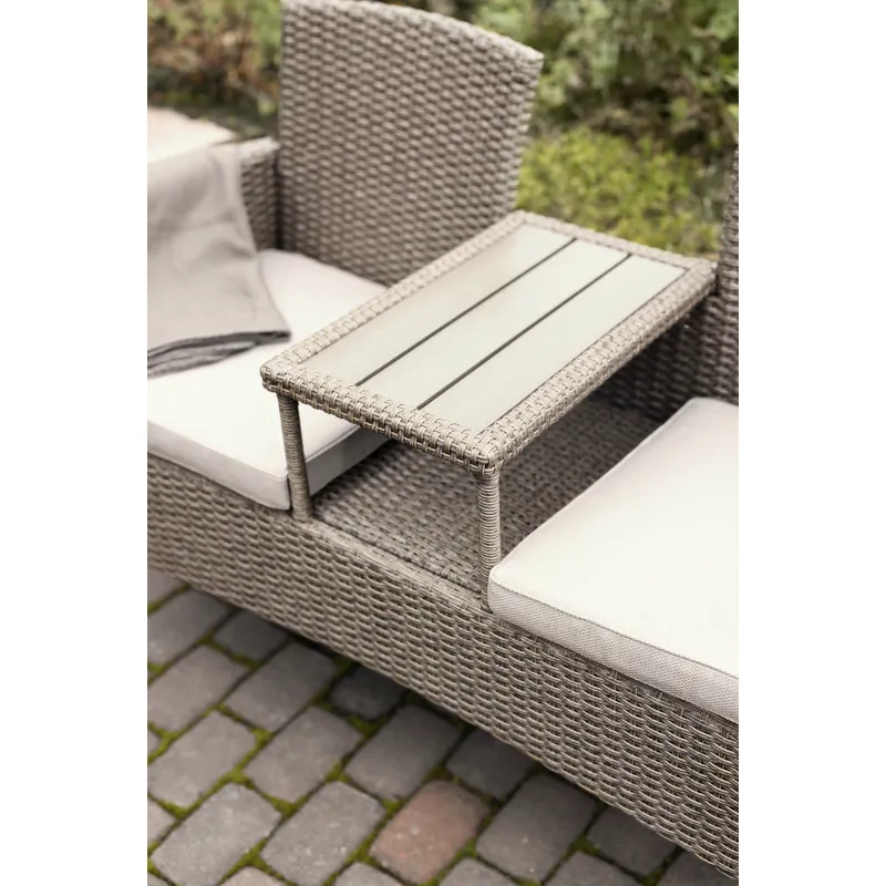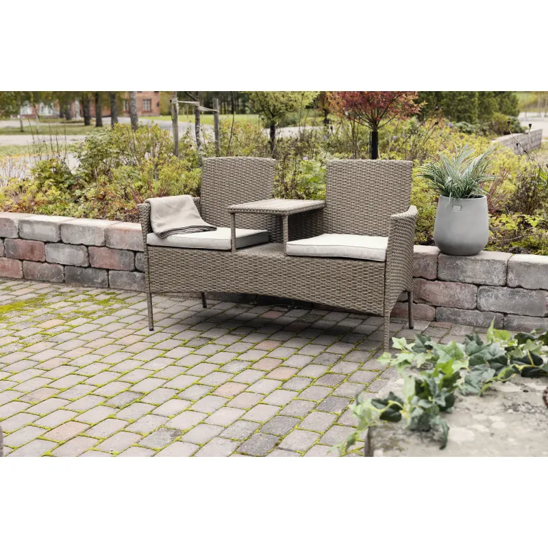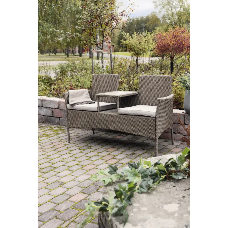 Садовая скамейка Valentano идеально подойдет для вашей террасы или балкона. Она оснащена двумя сиденьями и промежуточным столиком, а также подушками для сидения. Изготовлена из полиротанга, стальной рамы и столешницы из полидерева. Чехлы подушек съемные и могут быть выстираны вручную при температуре 30 °C. Размеры (Д x Ш x В): 138 x 61 x 83 см. Максимальная нагрузка: 110 кг на каждое сиденье, столик выдерживает до 10 кг.