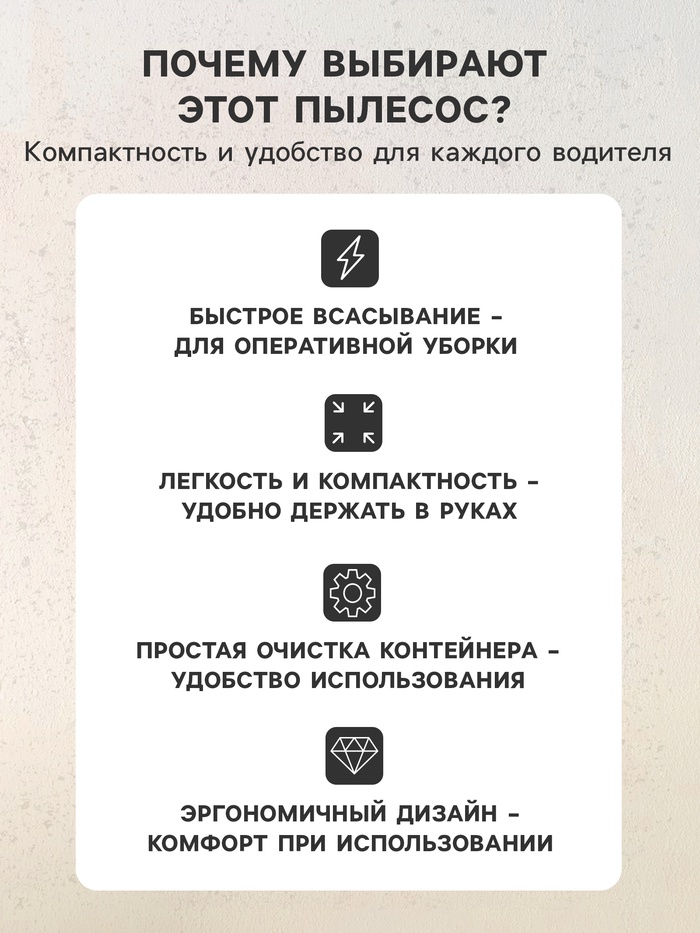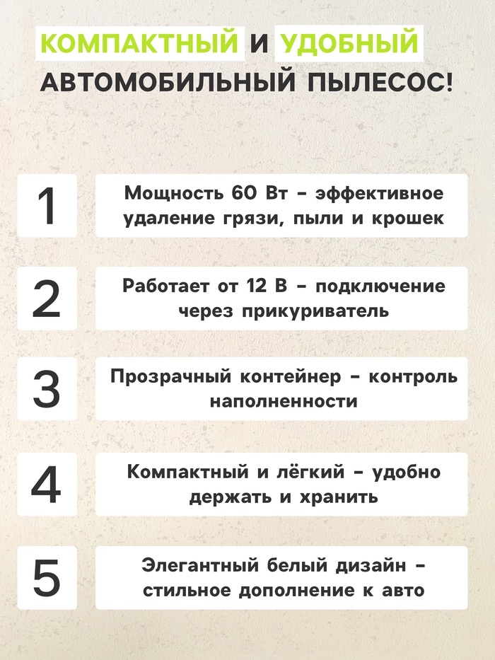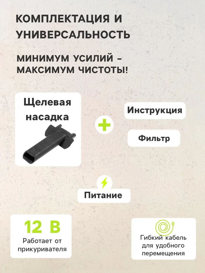 Пылесос автомобильный идеален для уборки салона автомобиля. Мощность 60 Вт позволяет собрать пыль, песок, пепел даже из самых труднодоступных мест салона. Питание от бортовой электросети легкового автомобиля 12В позволяет пользоваться пылесосом в любом удобном для вас месте. Компактный размер позволяет хранить пылесос в багажнике автомобиля.