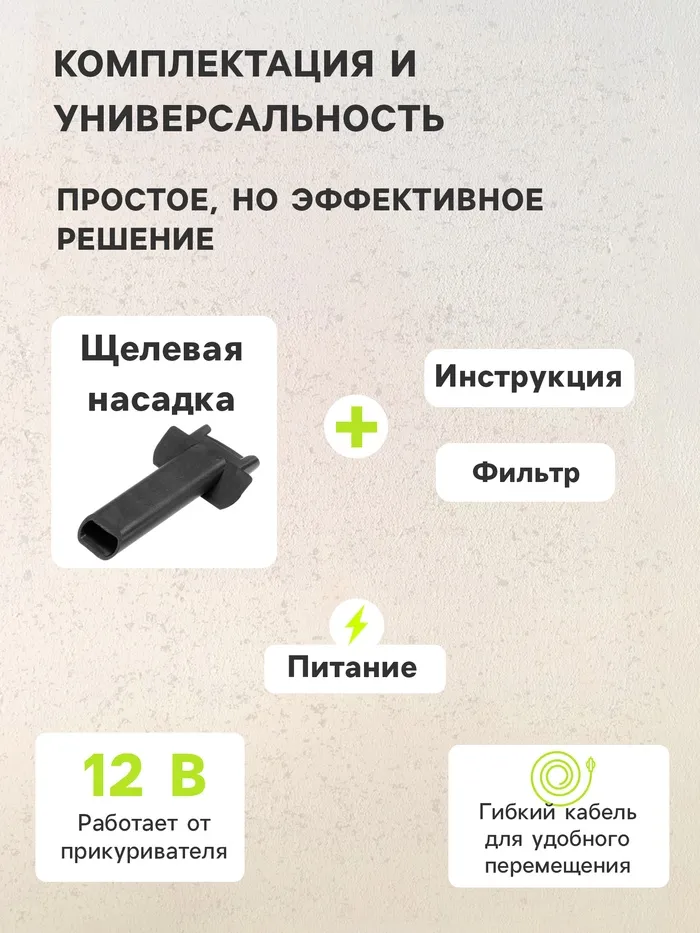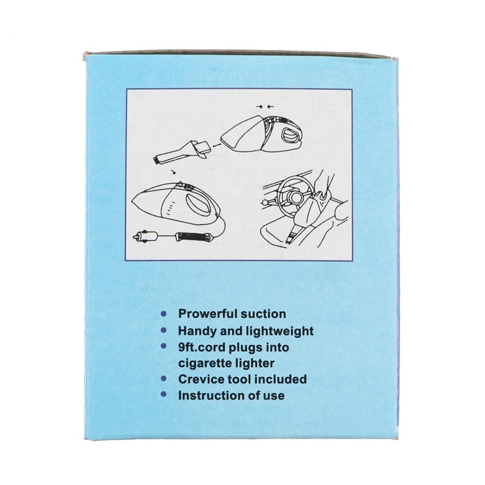 - Питание от бортовой электросети легкового автомобиля 12В позволяет пользоваться пылесосом в любом удобном для вас месте.