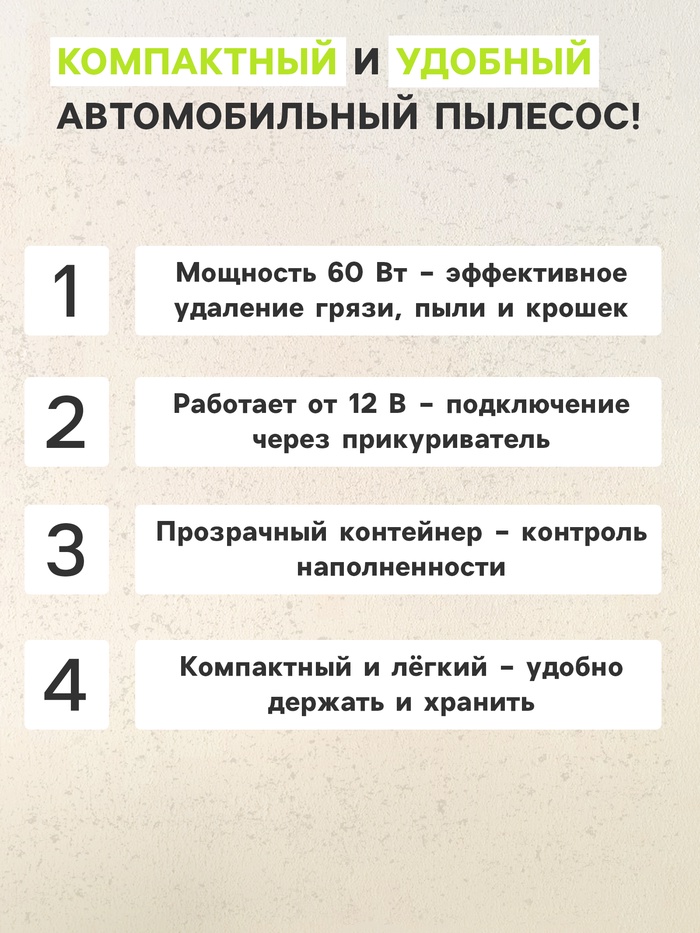 Пылесос автомобильный, 60 Вт, 12 В — Характеристики