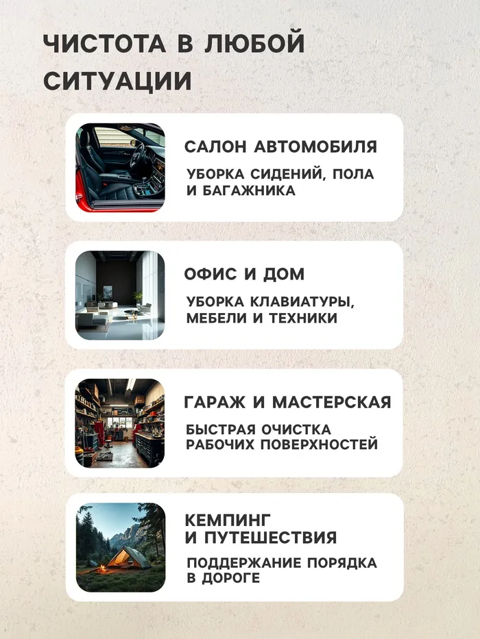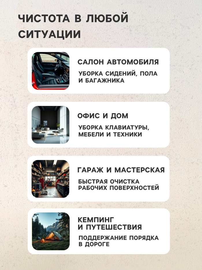 - Мощность 60 Вт позволяет собрать пыль, песок, пепел даже из самых труднодоступных мест салона.