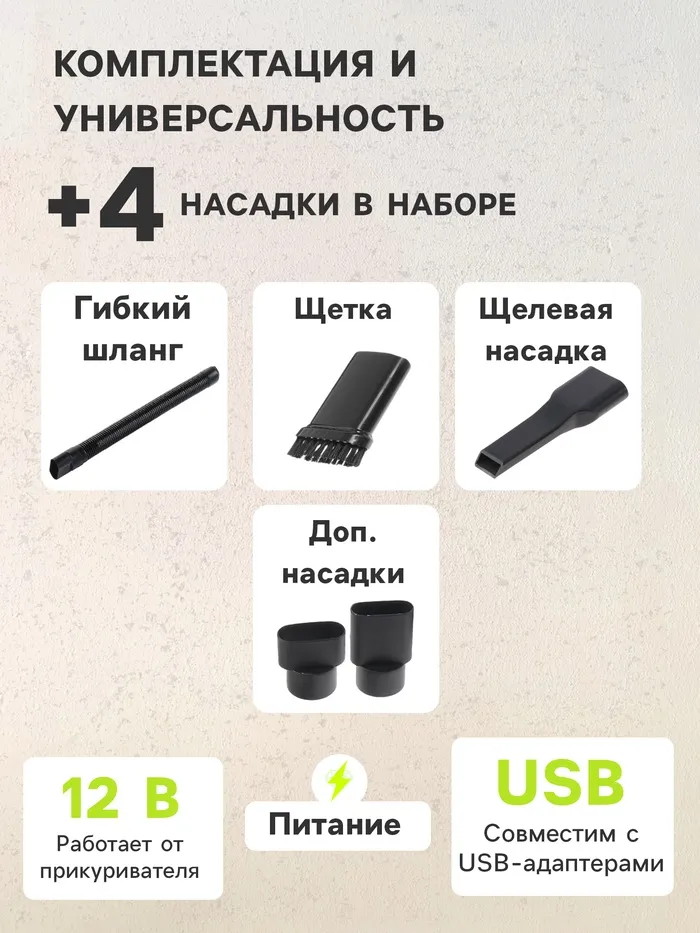 Пылесос автомобильный, беспроводной, 4 насадки, 120 Вт, 12 В, белый — Характеристики